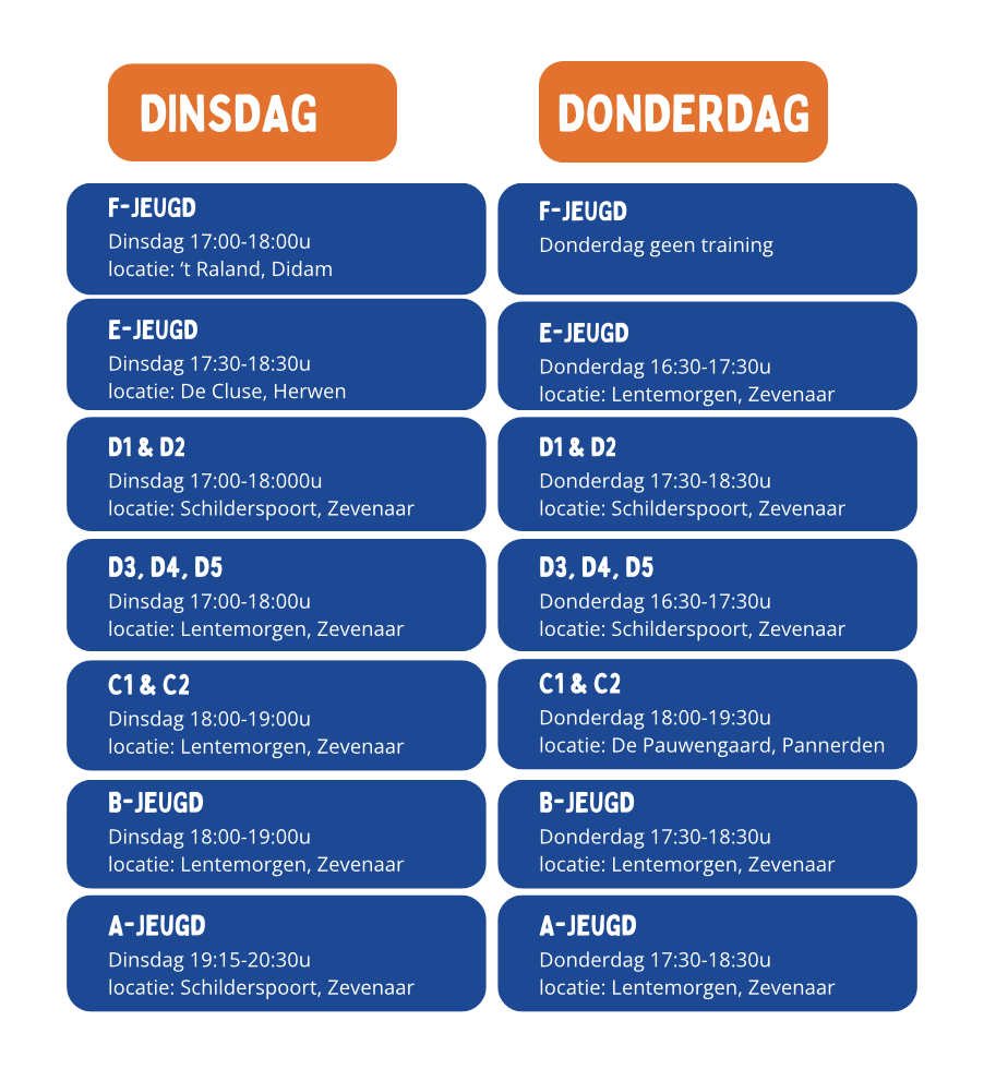 De veldtrainingen zijn in het voorseizoen van dinsdag 19 augustus t/m donderdag 4 september 2025. Vanaf dinsdag 9 september 2025 kan er weer binnen getraind worden. In het naseizoen zijn de veldtrainingen van dinsdag 5 mei t/m donderdag 2 juli 2026. De veldtrainingen zijn op de kunstgras- en de beachvelden op sportpark Hengelder bij Korfbalvereniging de Zwaluwen. Marconistraat 18, Zevenaar.